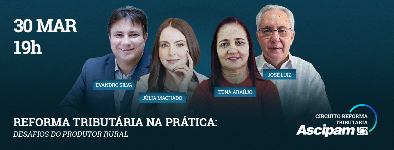 A Ascipam realiza no dia 30 de março de 2026 (segunda-feira), às 19h, mais um encontro do Circuito Reforma Tributária, desta vez com foco nos desafios enfrentados pelo produtor rural diante das mudanças no sistema tributário nacional. O evento será realizado no Espaço Multiuso Ascipam e é aberto a associados e ao público externo, com vagas limitadas. A iniciativa reforça o compromisso da entidade em oferecer informação qualificada e atual, alinhada à realidade do agronegócio.